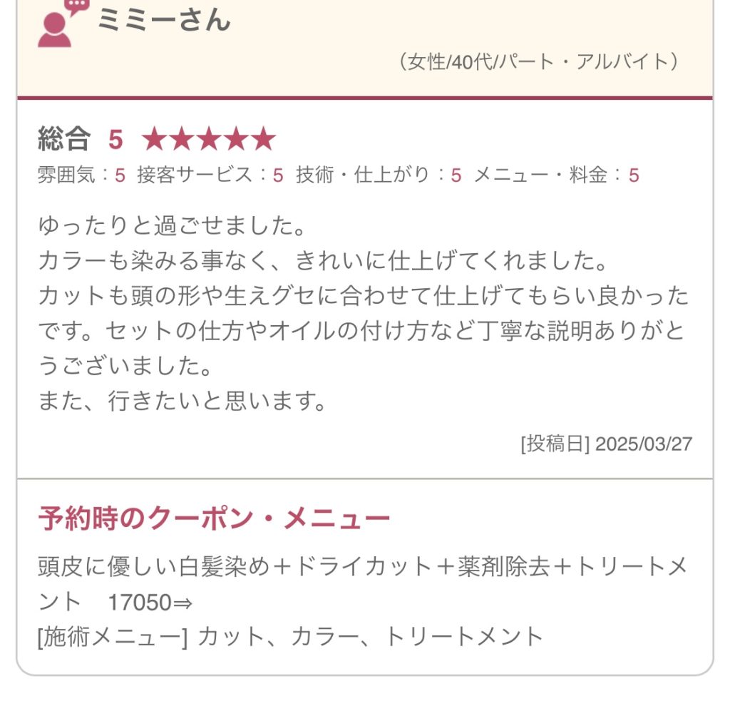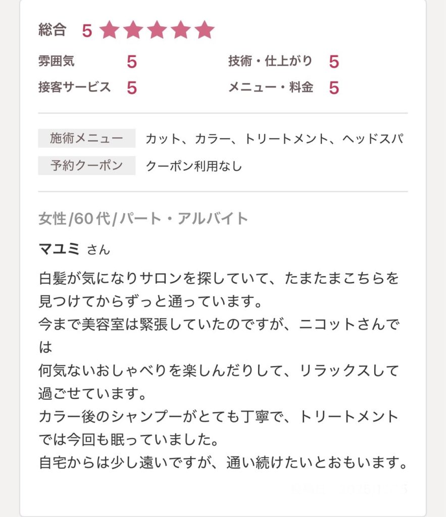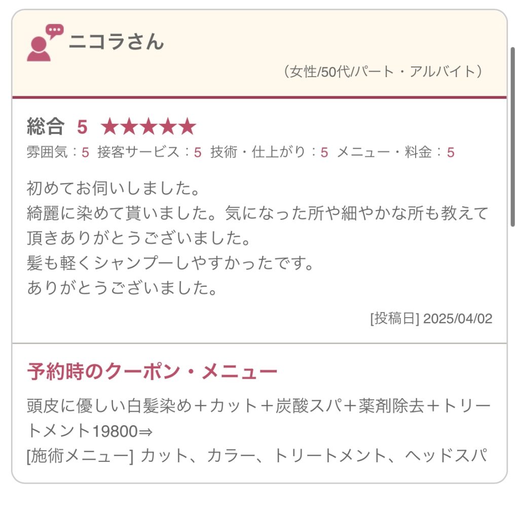 白髪もいつもきれいに染まってるよ。ありがとうね。