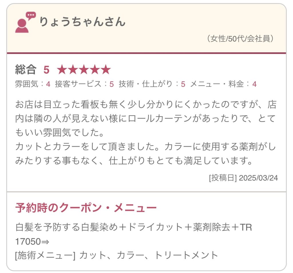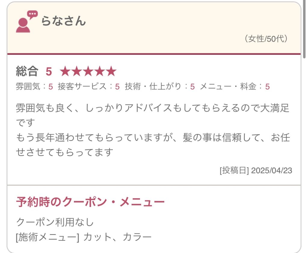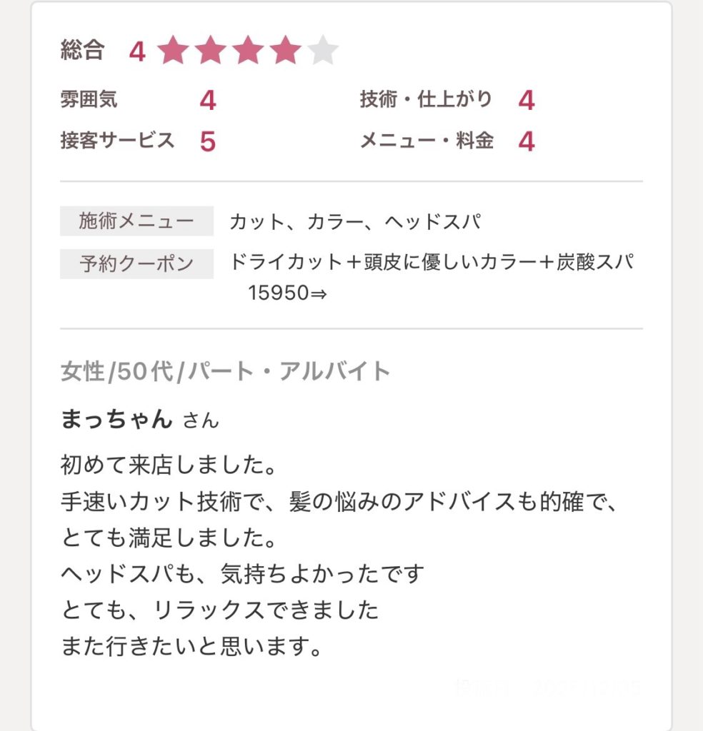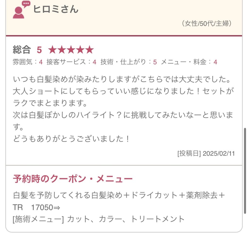 白髪もいつもきれいに染まってるよ。ありがとうね。